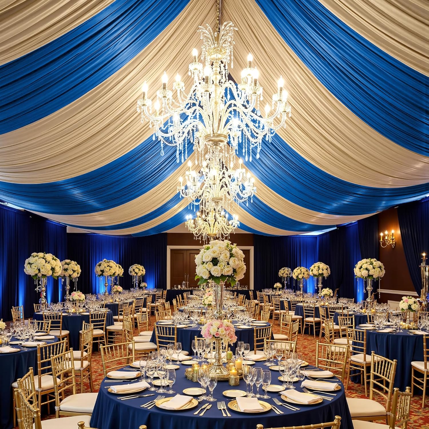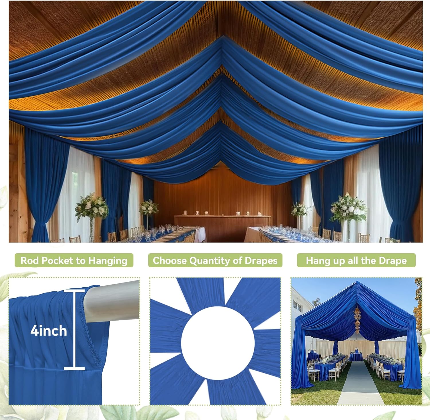 👰【Royal Blue Ceiling Drapes】The package will include 4 panels Royal Blue wedding drape curtain(without hanging pieces), each wedding extra long curtain measures 5 feet (60inch)wide x30 feet(360inch) long.The sufficient quantity can meet your demands for decorating your weddings, parties, receptions, and these Royal Blue ceiling drapes will create a delicate and aesthetic sense to your wedding ceiling decoration and light up every banquet.