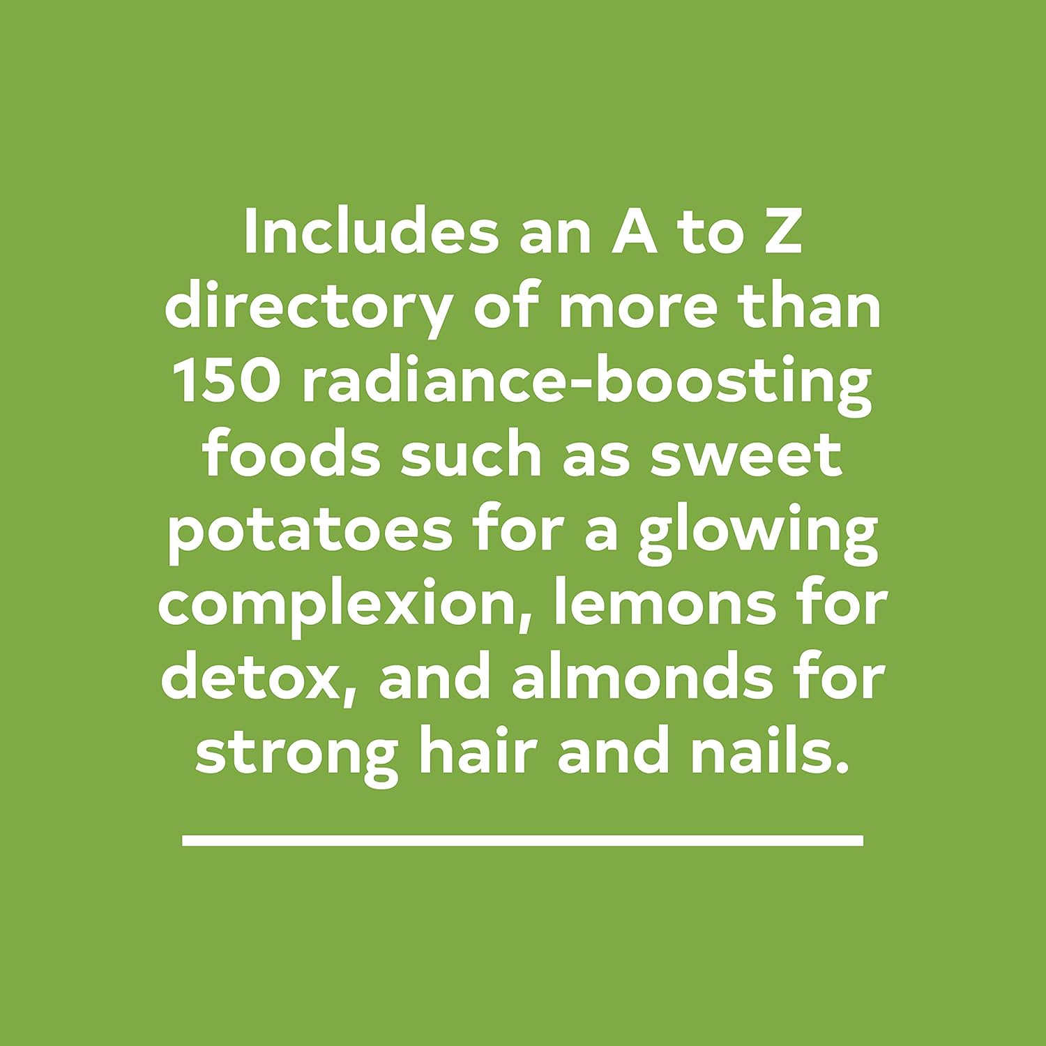 Includes an A to Z directory of more than 150 radiance-boosting foods such as sweet potatoes for a glowing complexion, lemons for detox, and almonds for strong hair and nails.