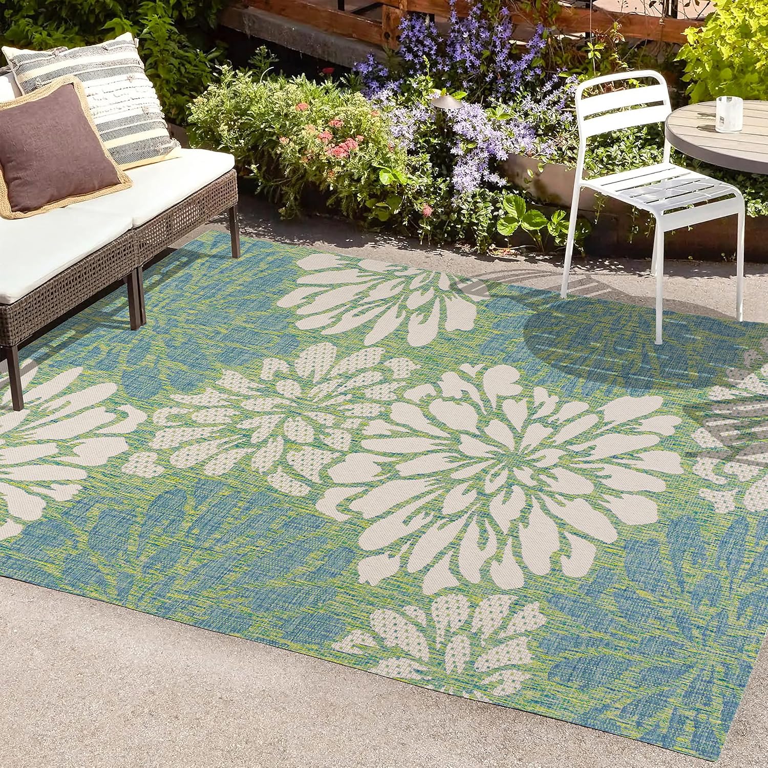 EASY TO CARE FOR: To wash an outdoor rug, spray the surface with a 5-1 mixture of mild dish soap and water; Then rise thoroughly with a garden hose and hang over a railing to dry thoroughly