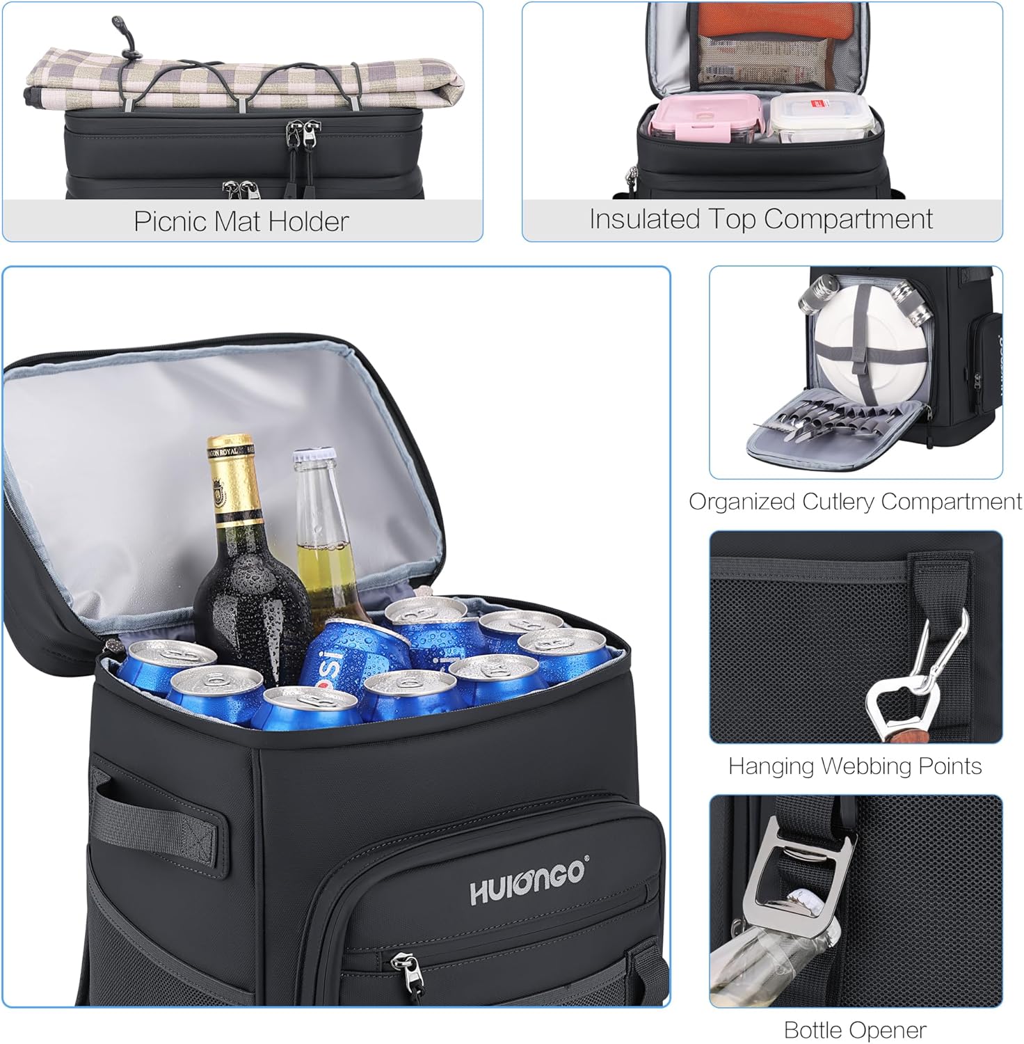 Organized and Accessible Storage: Designed with convenience in mind, the cooler backpack boasts two spacious insulated compartments for drinks and food, keeping them fresh and dry. The front features a roomy pocket, while two side pockets provide easy access to your snacks, phone, wallet, and more. Plus, a thoughtfully included bottle opener is always within reach.