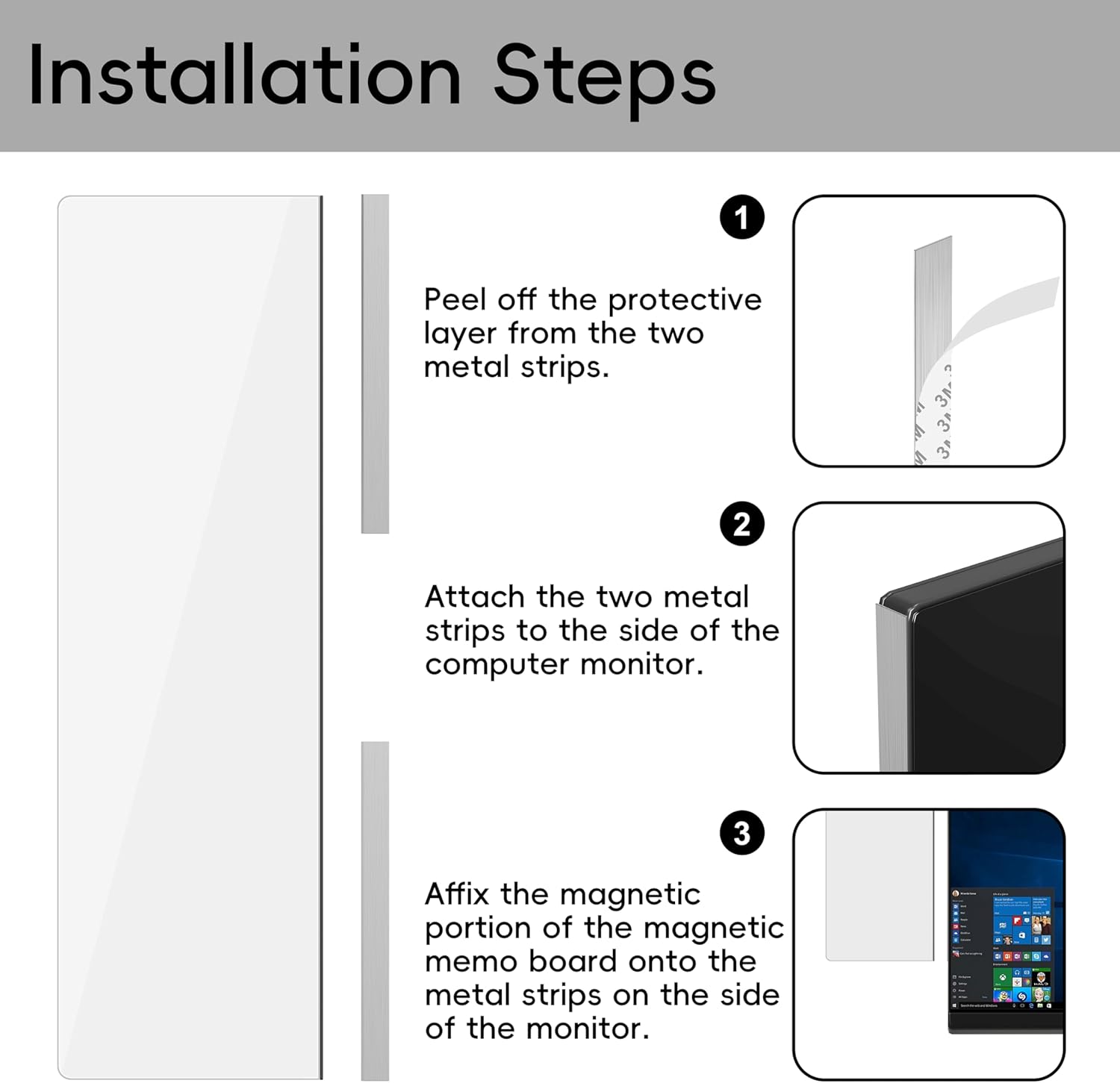 Easy to Install: This essential office gadget is easy to install and remove, offering a hassle-free setup process. Simply peel off the protective layer and attach two thin metal strip to the side of the computer monitor, affix the magnetic portion of the memo board onto monitor where it’s most convenient for quick access to important notes and reminders.