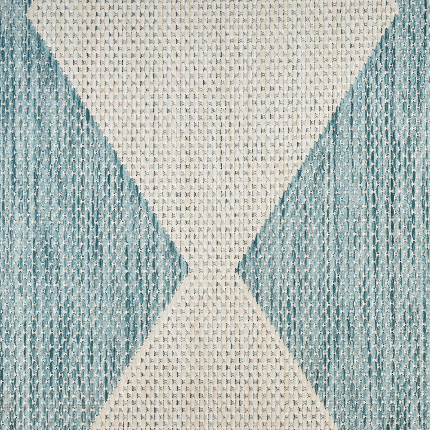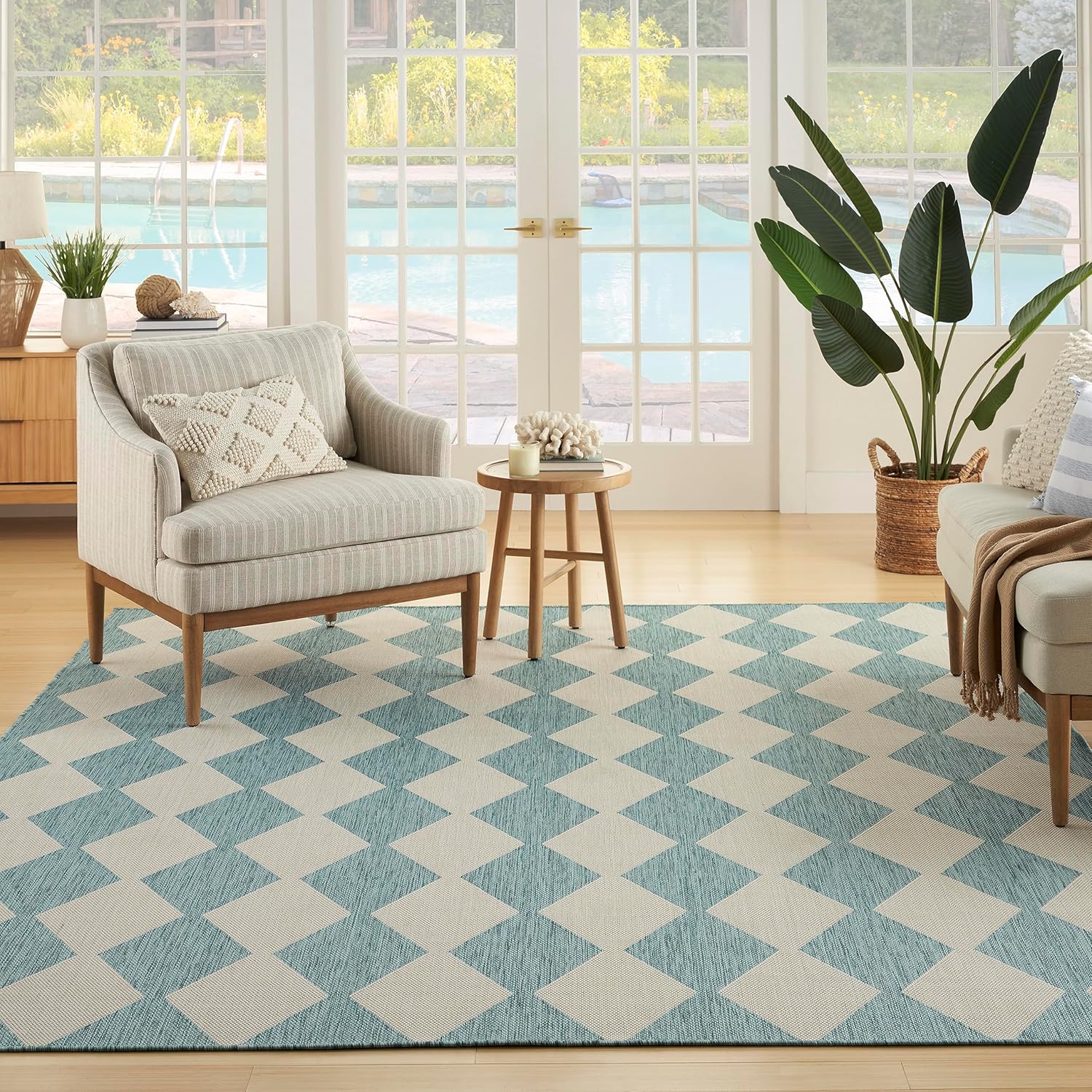 Upgrade your outdoor lifestyle with the rich, textural appeal of a Positano outdoor rug. These flatweave rugs are elegant enough for your living room or dining room, yet durable enough to enjoy outdoors on your porch, patio, or deck! Choose from a spectrum of versatile neutrals and colorful rugs that display exciting variations thanks to the space-dyed, striated yarns. Machine-made from polypropylene for easy cleaning: just hose rinse and air dry. Make a statement both inside and outside your home with this checkered diamond outdoor rug from the Positano collection. The retro tile-inspired design adds a stunning pop of pattern, boosted by a space-dyed color effect in aqua blue. This versatile rug is flat woven for easy placement in all your most used rooms – from the living room, kitchen, and bathroom to the patio, backyard, or deck.