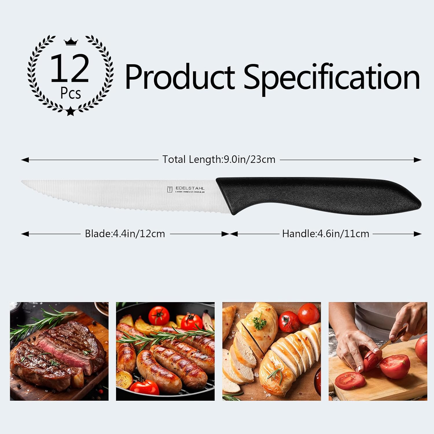 Steak Knife, Steak Knives Set of 12,Sharp Serrated Steak Knives,Premium Stainless Steel Steak Knife Set,Steak Knifes for Kitchen/Home/Hotel,Elegant Black Knife,Dishwasher Safe
