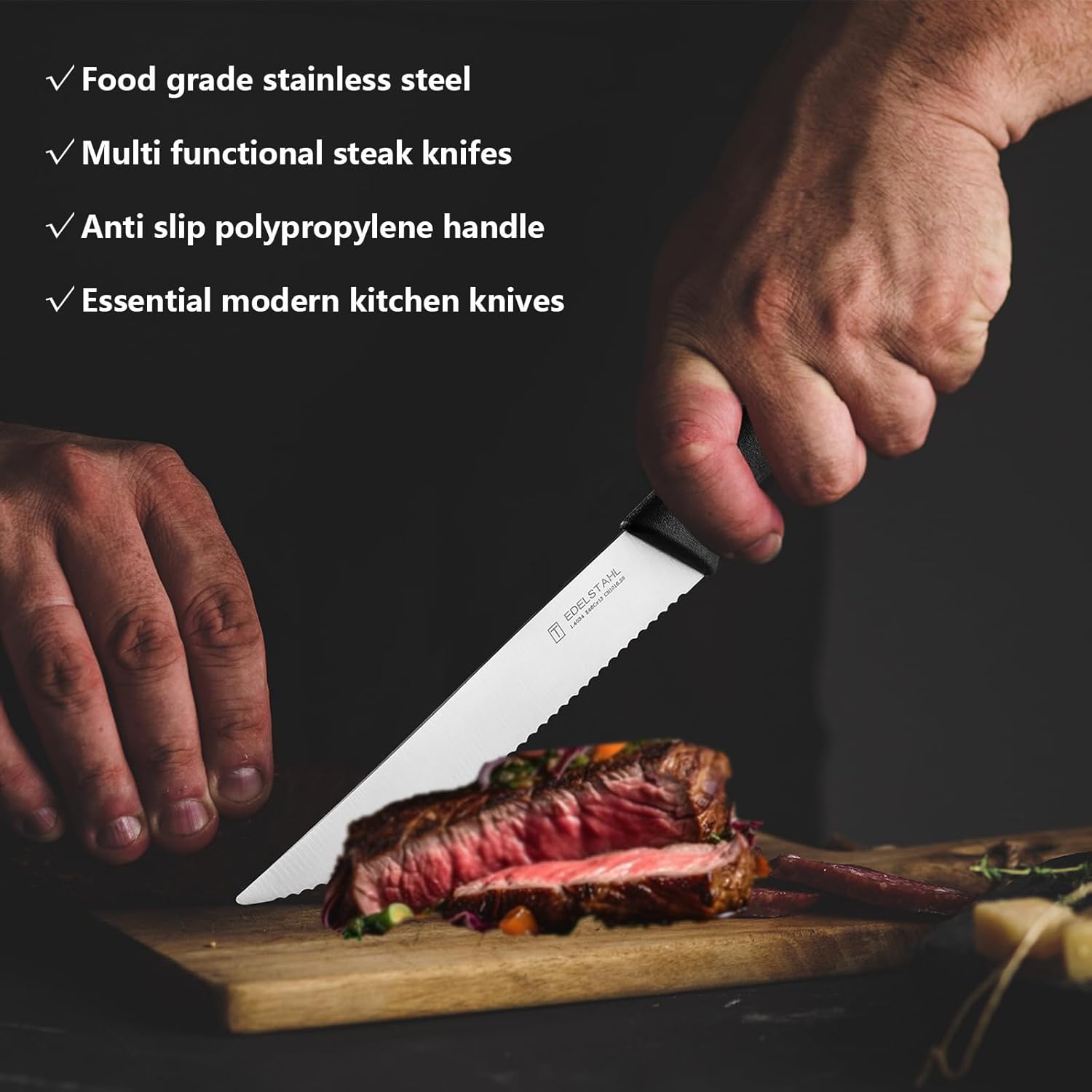High Quality Design:The serrated steak knife sets is made of food grade stainless steel,with high-quality steel plates that are extremely hard and have a long lifespan.It’s corrosion-resistant and rust proof,and the fine polishing ensures that the kitchen steak knives will not fade.Paired with an ergonomically designed plastic polypropylene handle,it’s sturdy and balanced in weight,making it very suitable for modern kitchen and easy to operate.