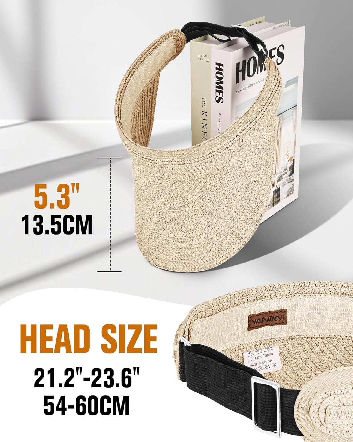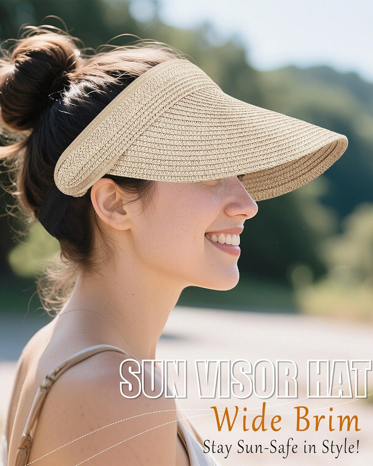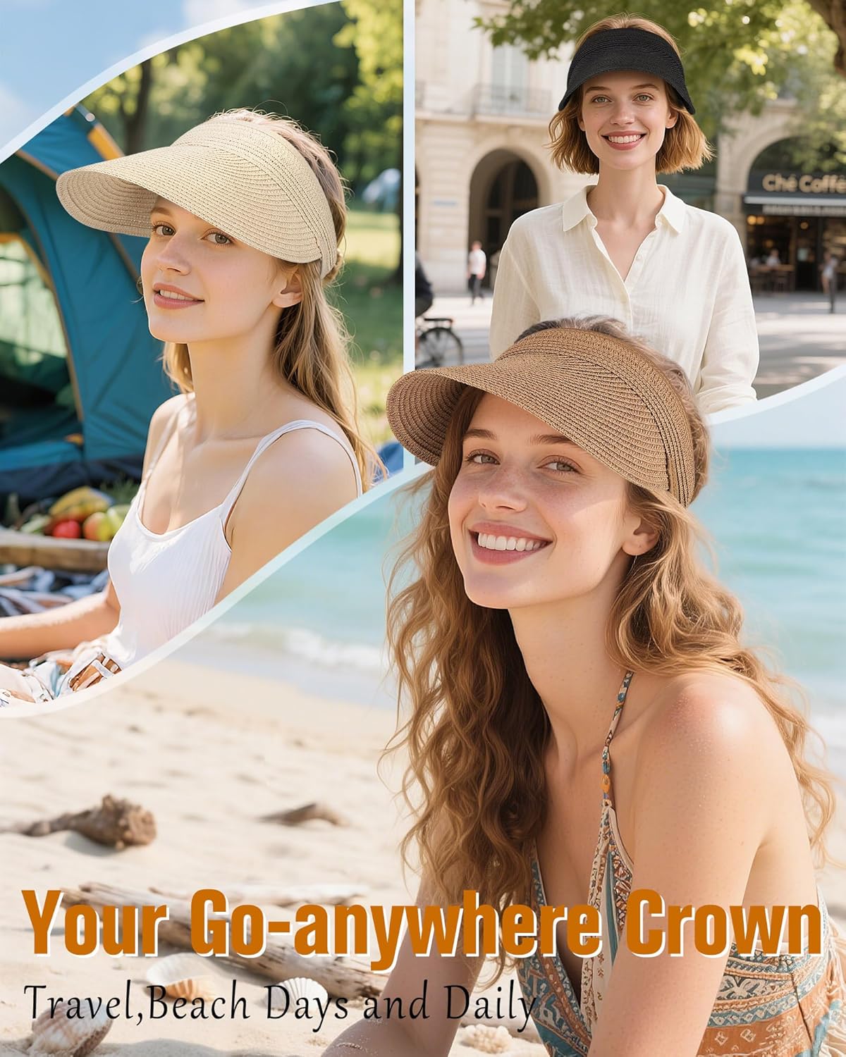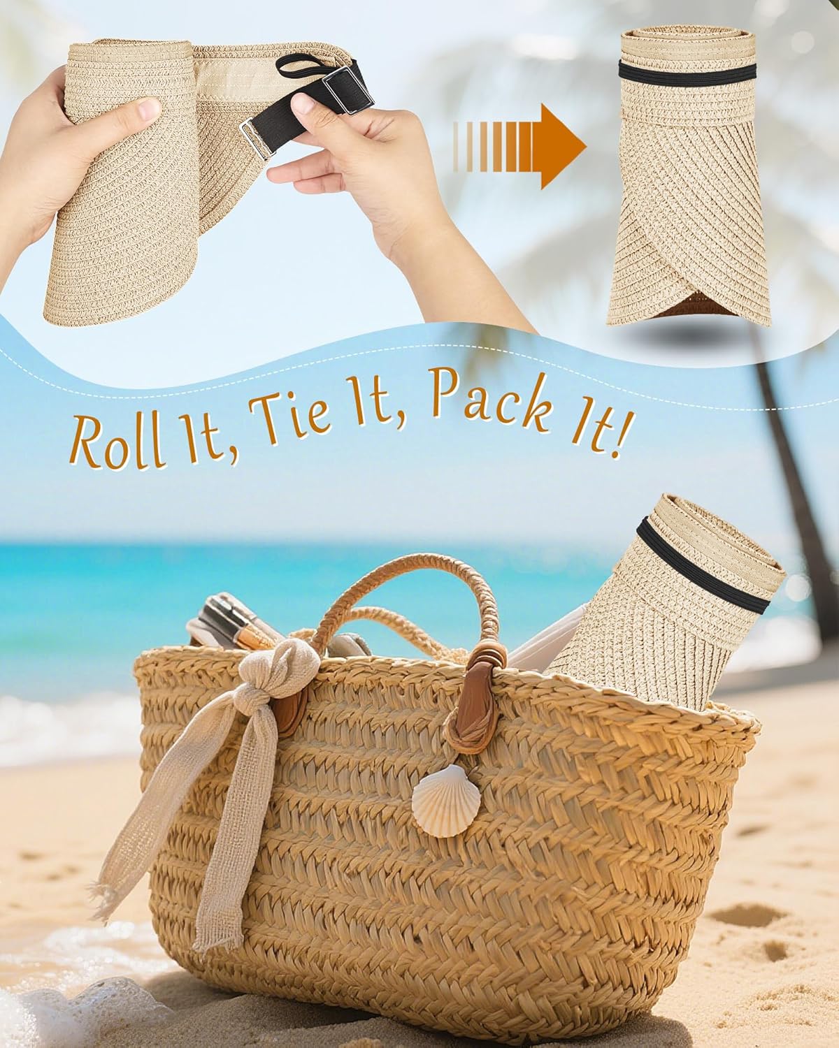 Sun Visor Hats for Women, UV Protection Straw Sun Hat, Packable Ponytail Beach Hat for Summer Travel & Outdoor Activities