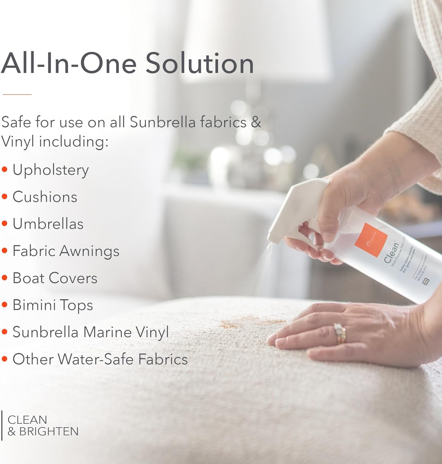 Sunbrella Clean Multi-Purpose Fabric Cleaner | All-in-One Solution for Water-Safe Fabrics and Vinyl | Upholstery Cleaner, Removes Stains & Spills | Non-PFAS | 16 fl oz