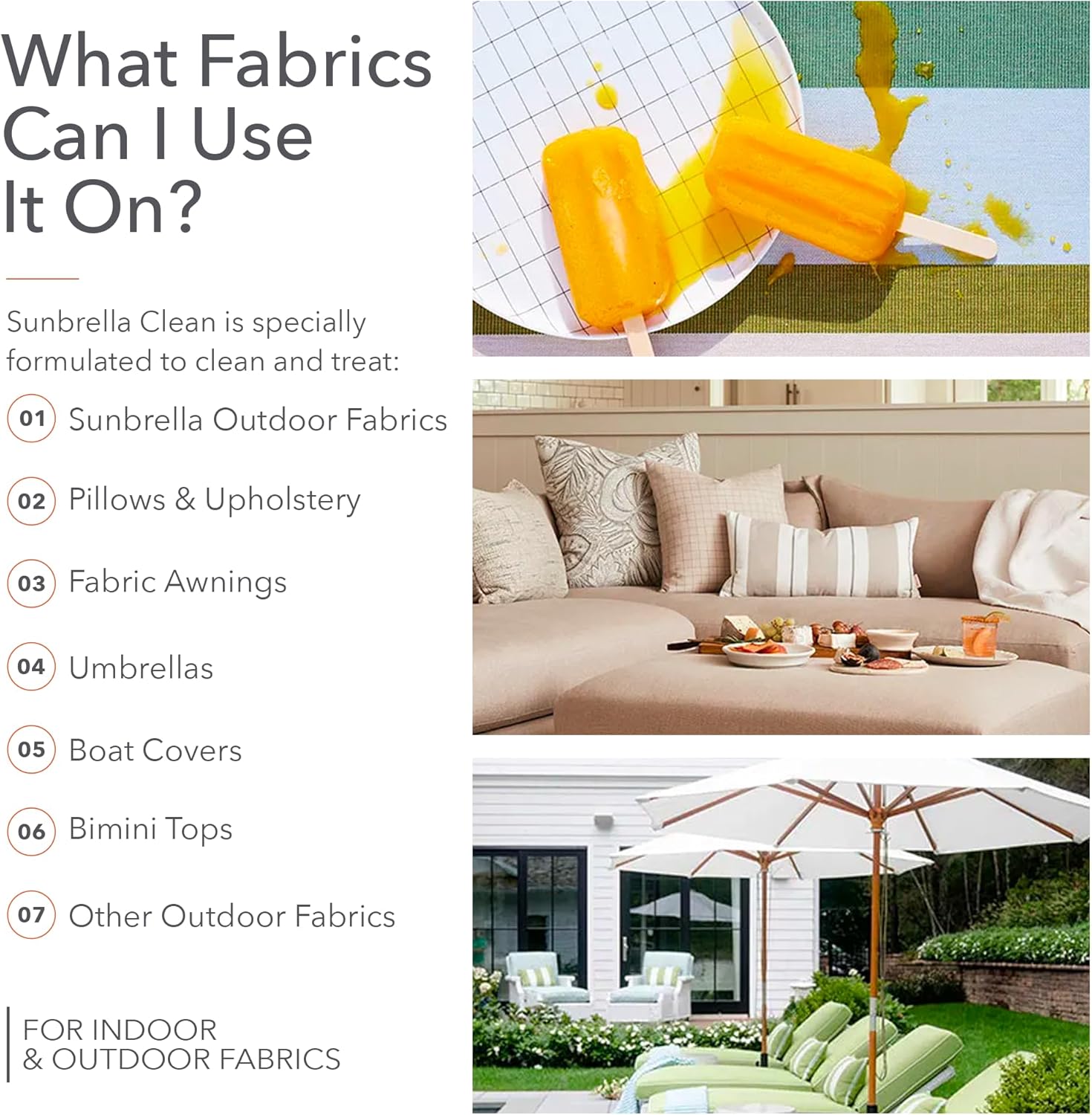 VERSATILE FABRIC & VINYL CLEANER — Effectively works on Sunbrella fabrics & vinyl – upholstery, cushions, umbrellas, boat covers, Bimini tops, and more, ensuring thorough cleaning for water-safe textiles.