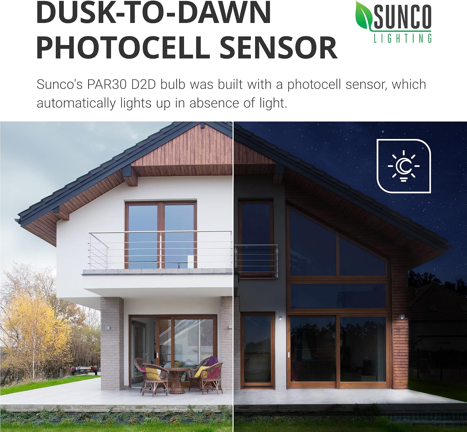 ✅ DUSK TO DAWN – Sunco’s PAR30 LED Dusk to Dawn Bulb powers on automatically at sunset. Leave the power on to activate the sensor. The photocell sensor detects light levels to act as an automated night light.