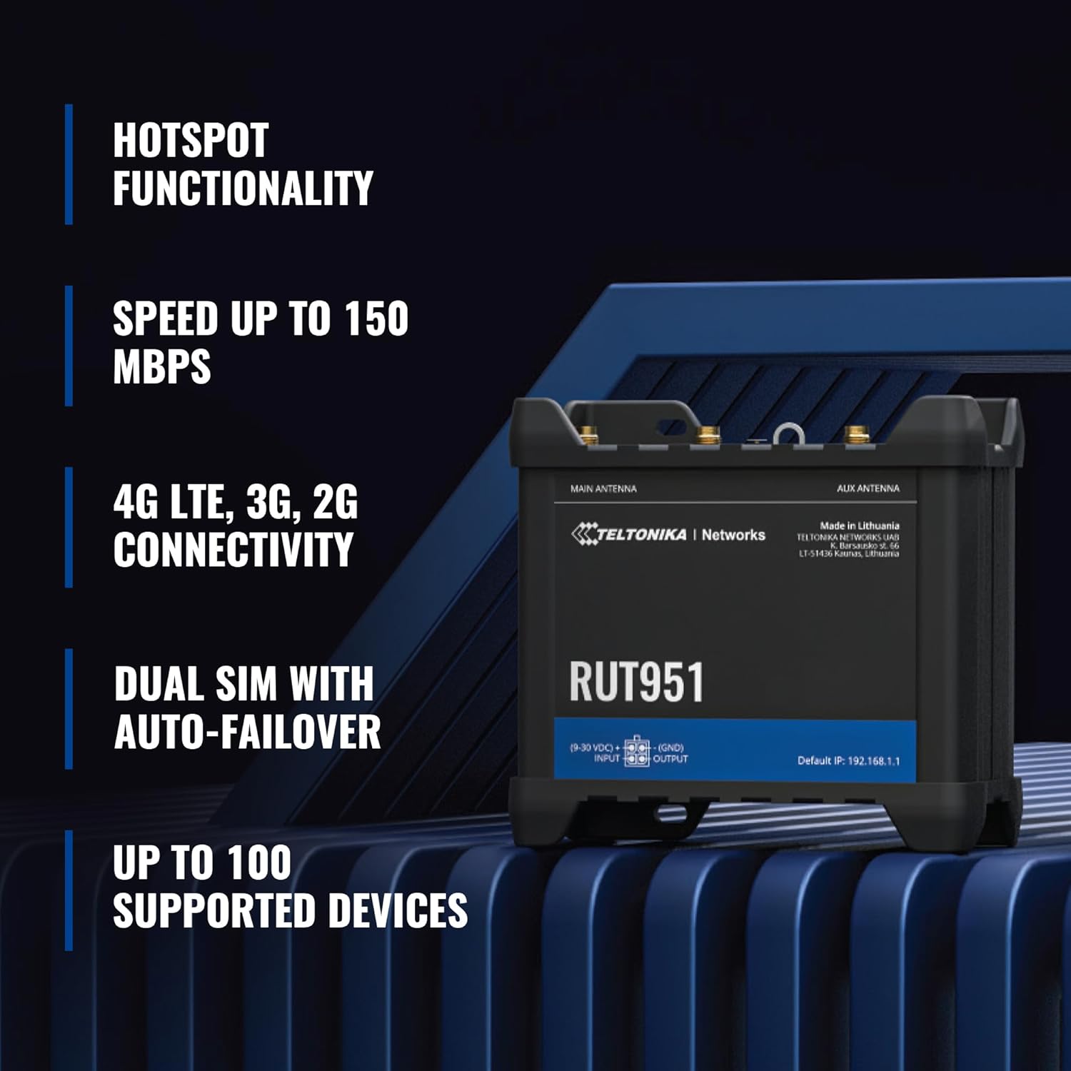 DUAL-SIM 4G LTE CONNECTIVITY: The RUT951 is a high-performance 4G LTE router with SIM card slots, supporting CAT 4 LTE, 3G, and 2G connections with data speeds up to 150 Mbps. This dual-SIM router ensures uninterrupted service with automatic failover to network backup, perfect for maintaining robust internet access in varied IoT scenarios.