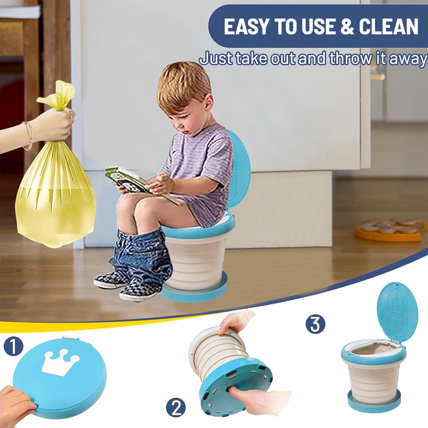 【Package Use】Unique two-stage pull twist design, folding and unfolding in seconds. portable potty for kids can be used immediately upon receipt, no assembly required.