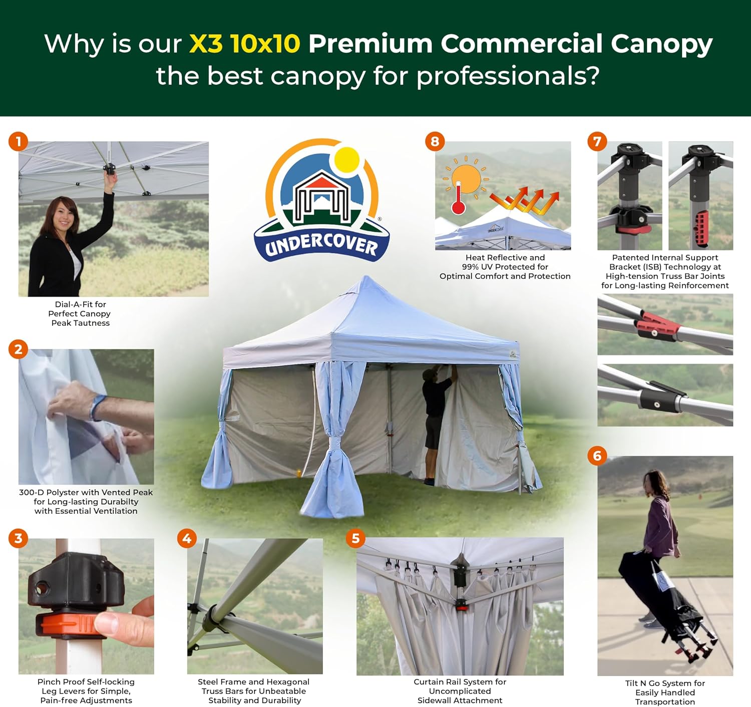 UNDERCOVER X3 10×10 Commercial Canopy with Sidewalls Wheel-Away Portable Tent (White)